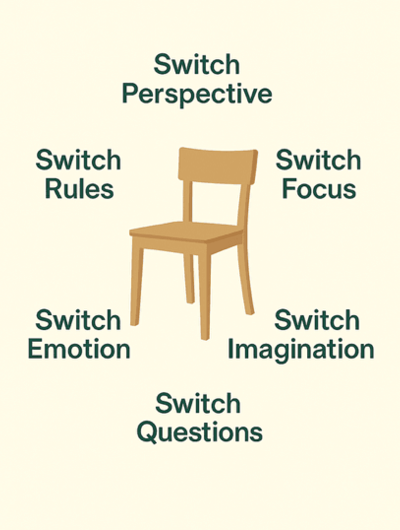 These are: Switch Perspective, Focus, Imagination, Emotion, Questions and Rules.
